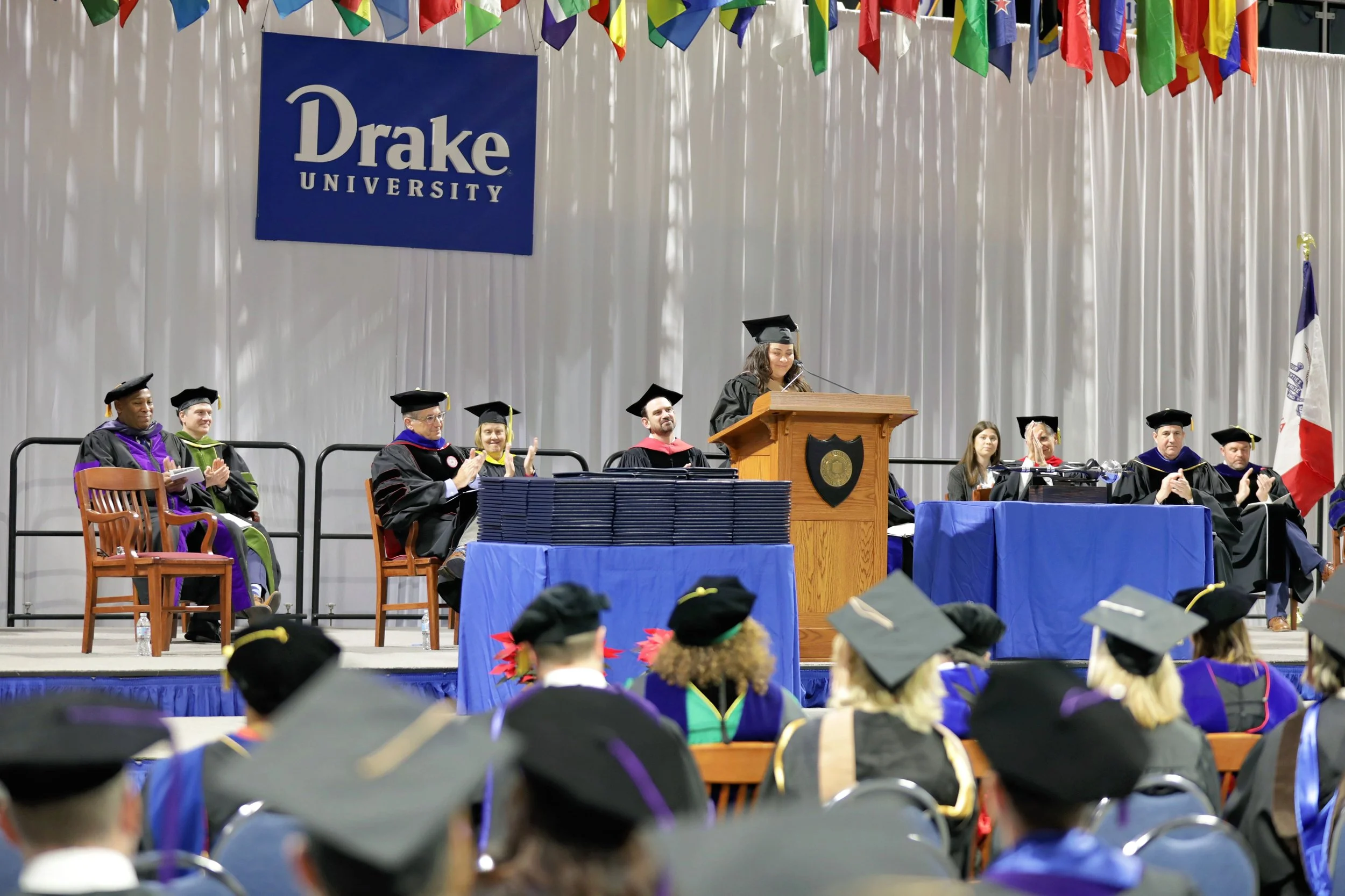 Es un privilegio y honor hablar con ustedes esta mañana. Esta es mi tercera graduación en este edificio. La primera vez que caminé por este escenario fue en 2013, cuando me gradué de la secundaria. Ese día me obsesioné con el concepto de graduación. Eso es lo que me mantuvo motivado durante mis estudios universitarios en Drake para graduarme con mi licenciatura en 2017 y aquí estoy nuevamente, en otra graduación de Drake, y probablemente la última, obteniendo mi Maestría en Administración de Empresas exactamente en el mismo edificio en el que lo hice hace casi 11 años despues.